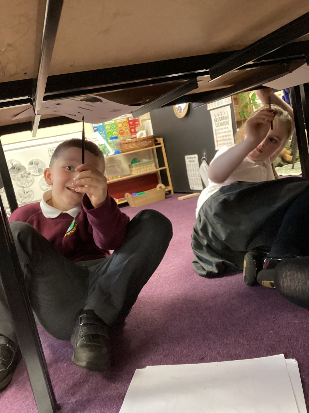 Year 3 used charcoal, chalk pastels and paint to produce cave art. They worked so well in their caves under their tables!