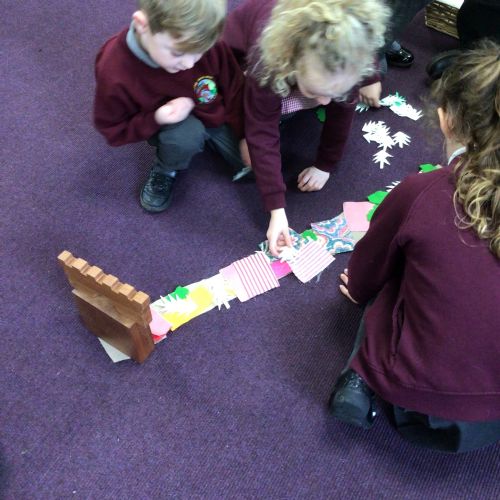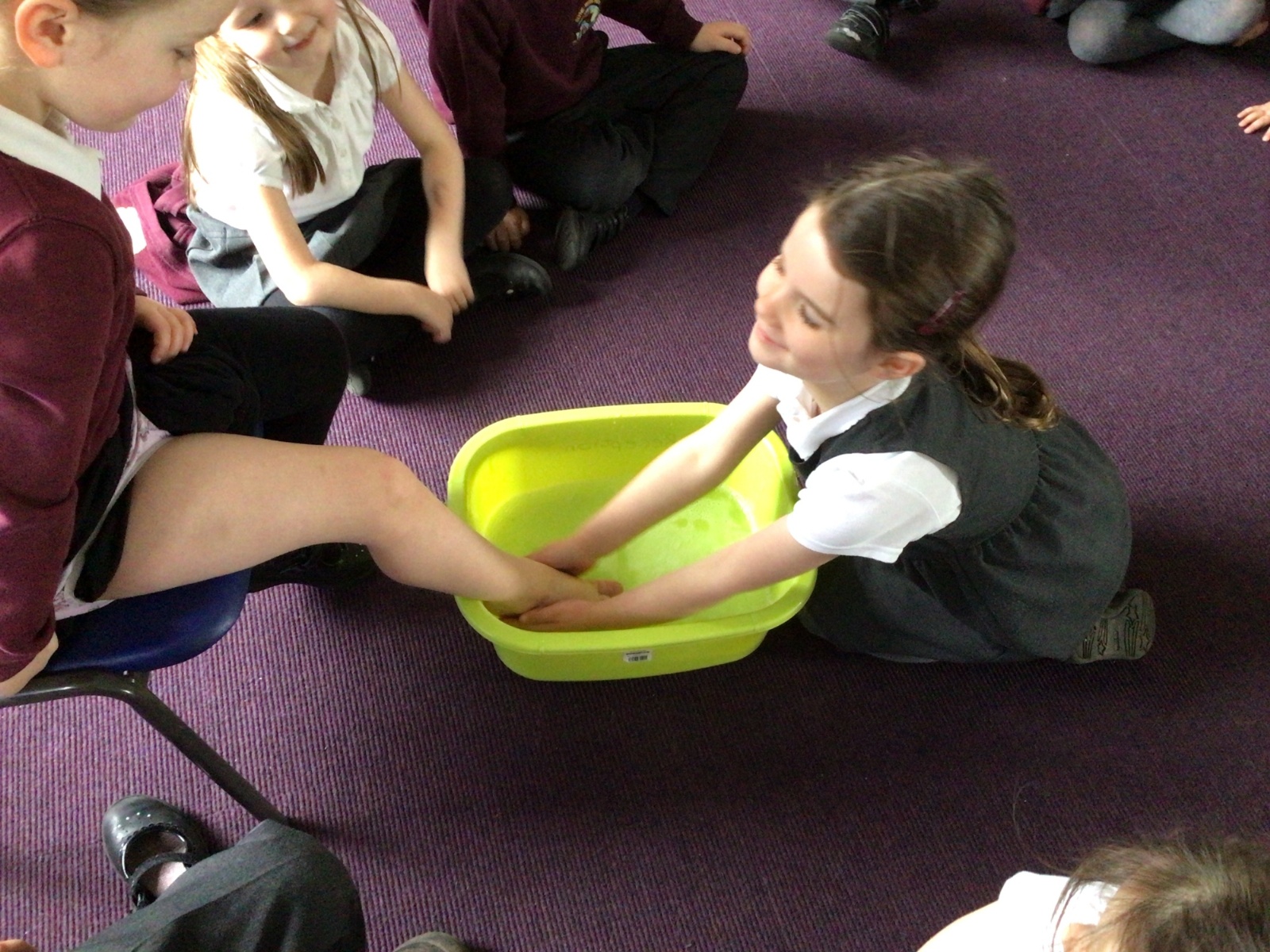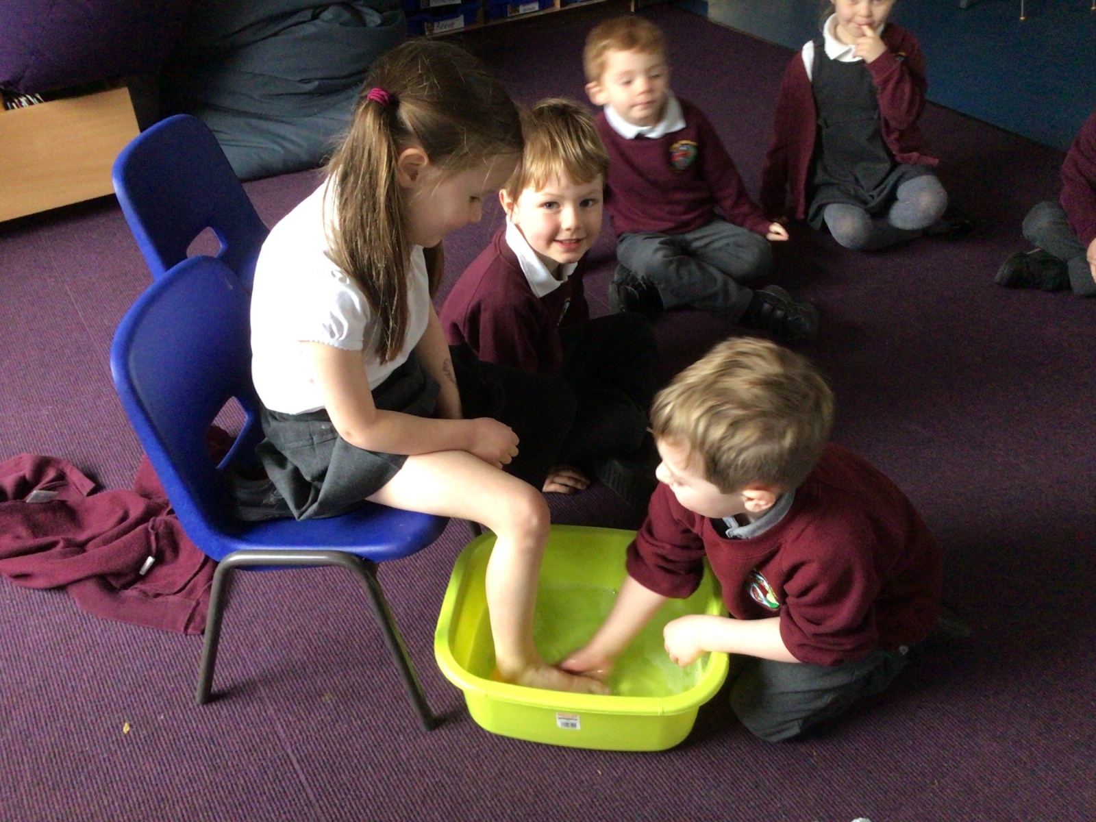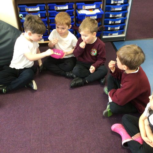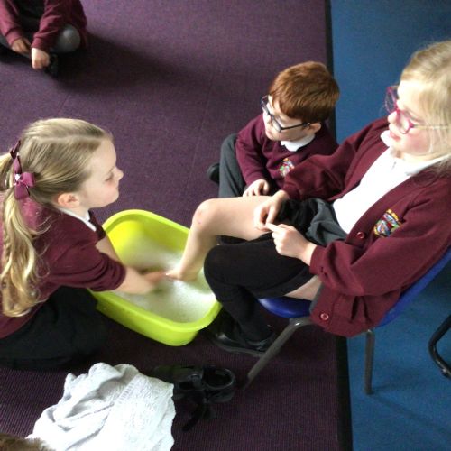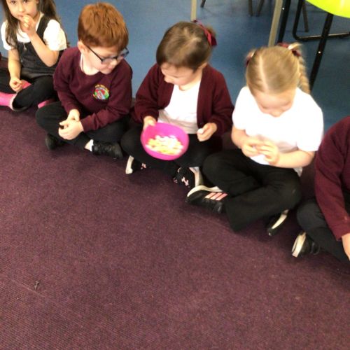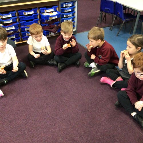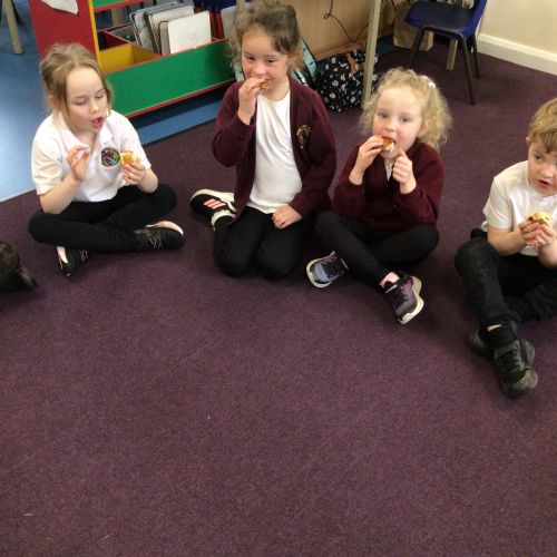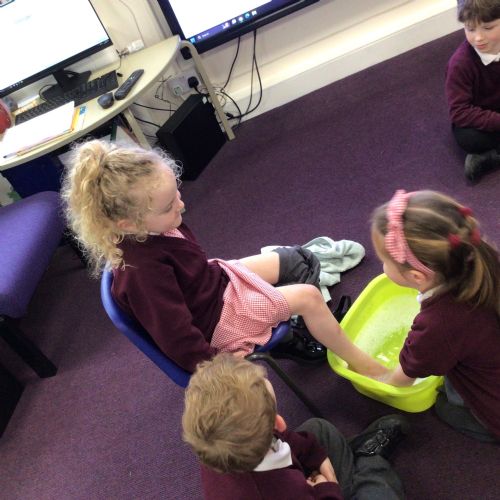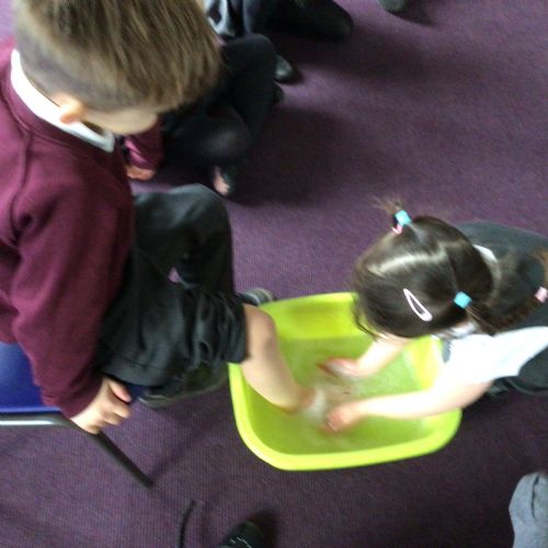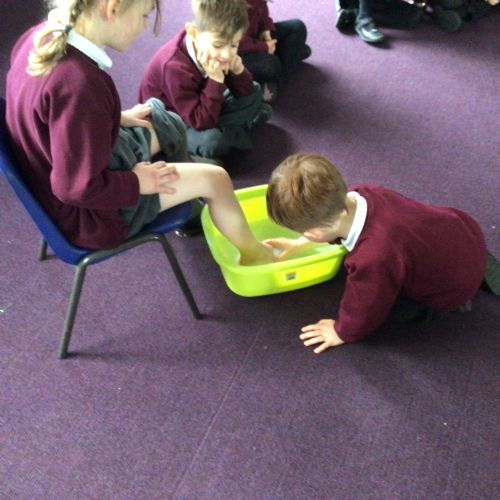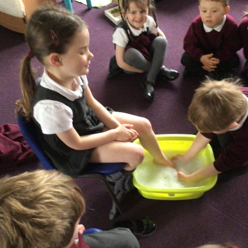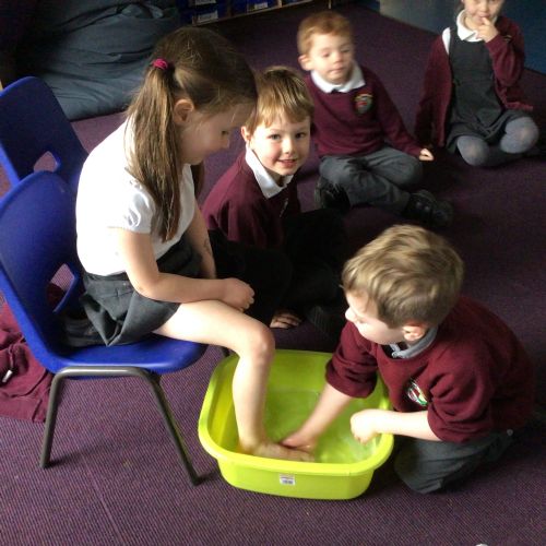 We have started to think about the Easter story. We tasted chocolate eggs, ginger biscuits and hot cross buns – they were delicious! We have explored the story of Palm Sunday through Godly Play, and we washed each other's feet to remind ourselves that Jesus did this for his disciples. We had the story of the Last Supper through Godly Play too.