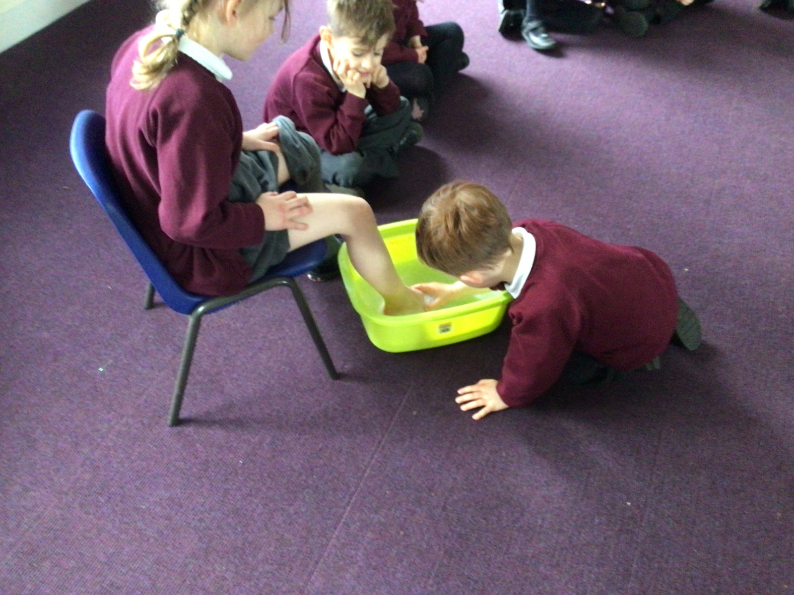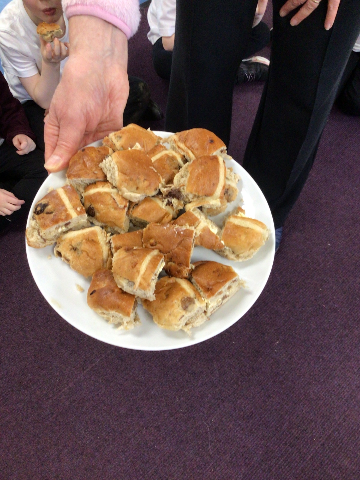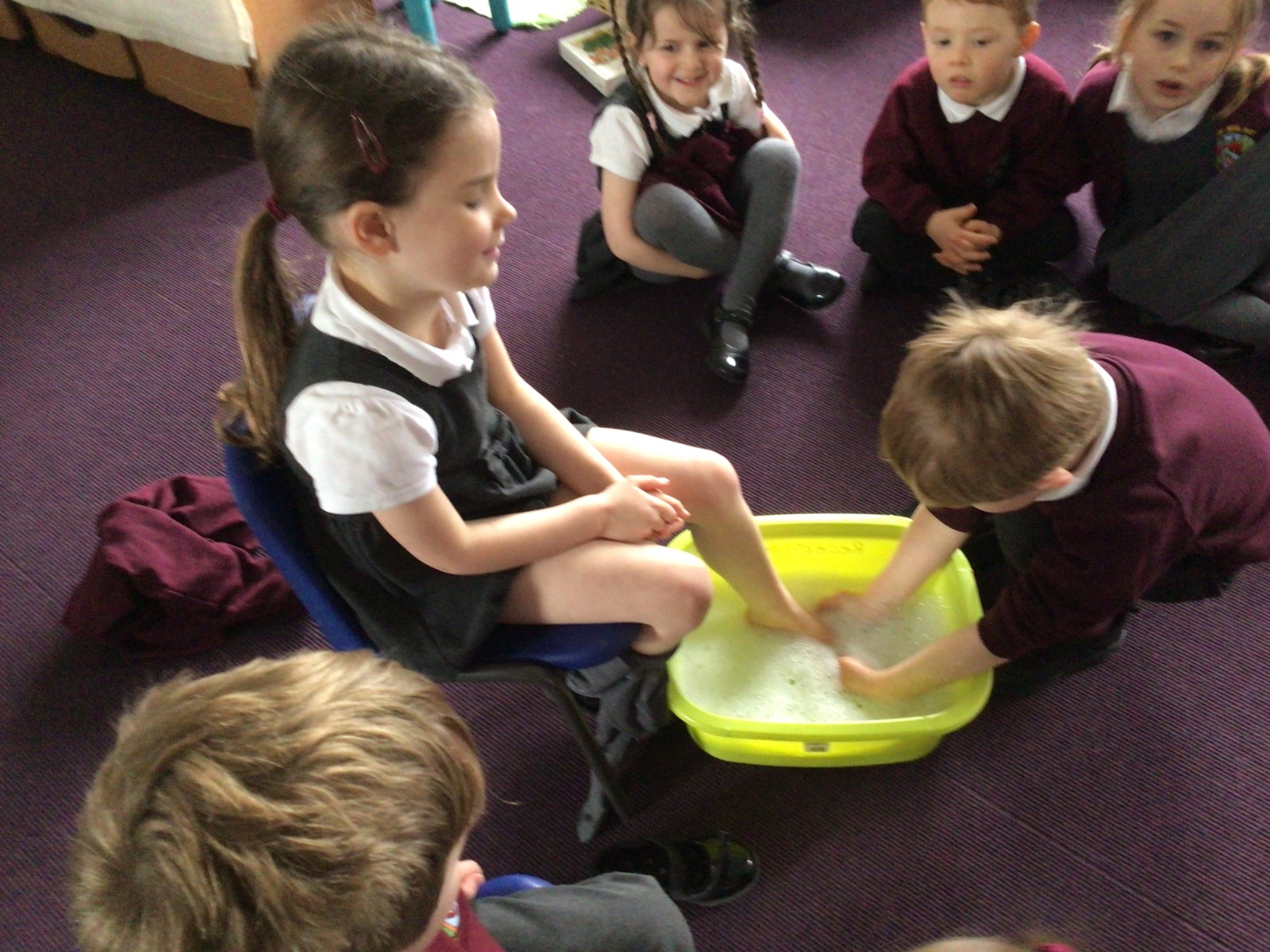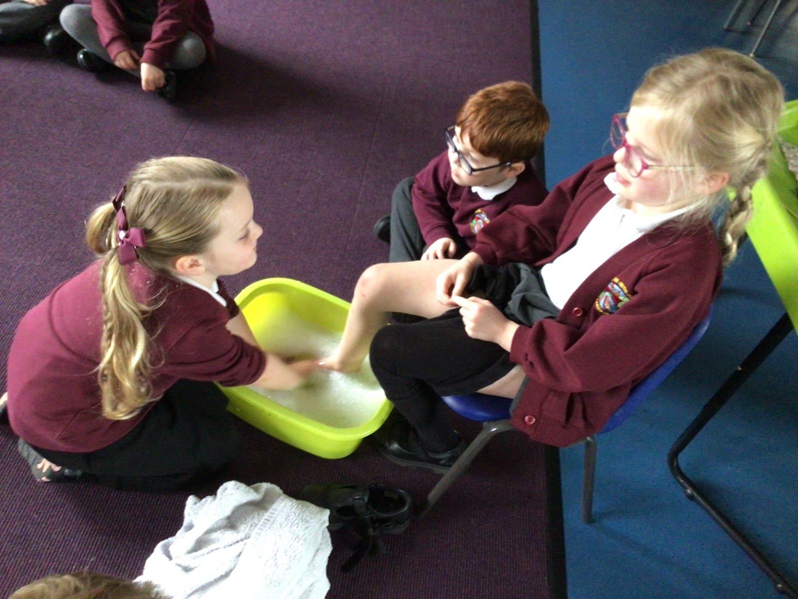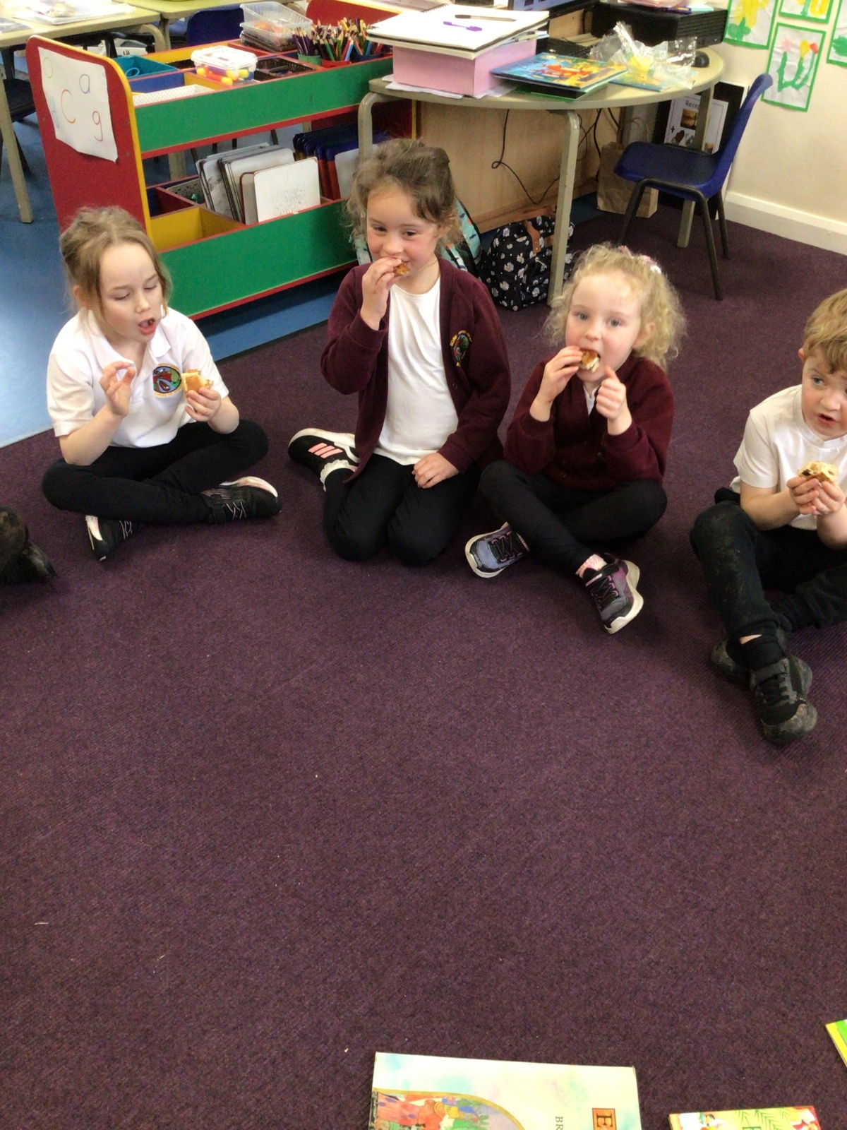 We have started to think about the Easter story. We tasted chocolate eggs, ginger biscuits and hot cross buns – they were delicious! We have explored the story of Palm Sunday through Godly Play, and we washed each other's feet to remind ourselves that Jesus did this for his disciples. We had the story of the Last Supper through Godly Play too.