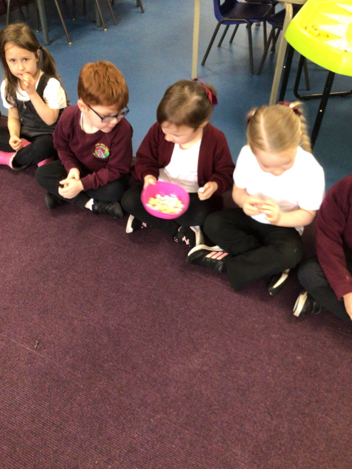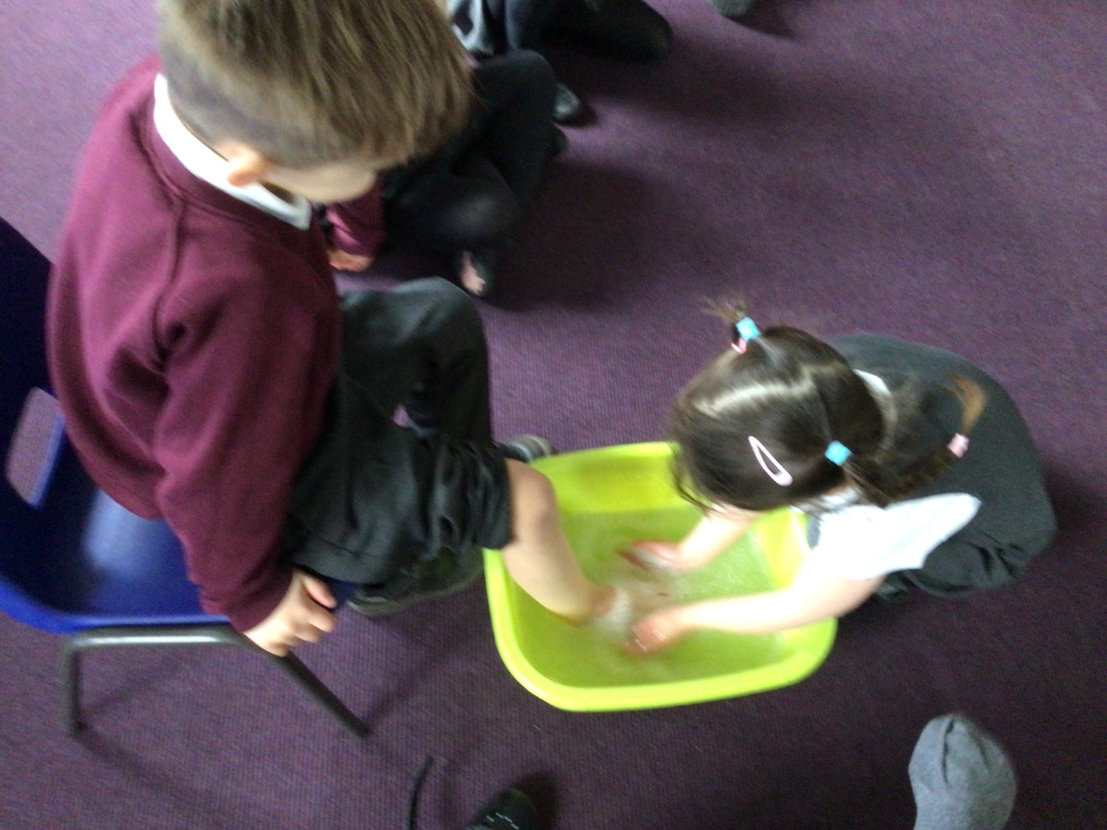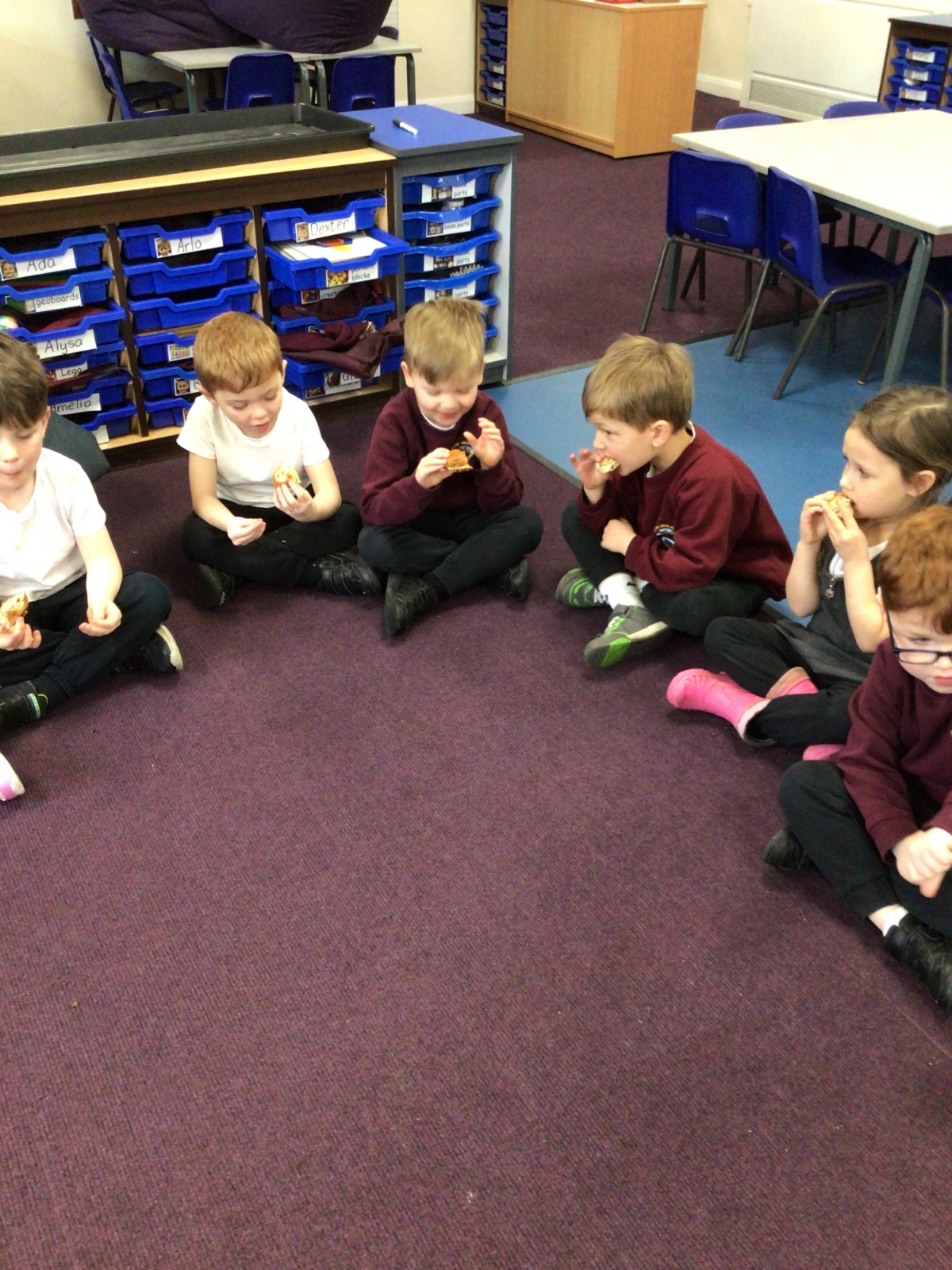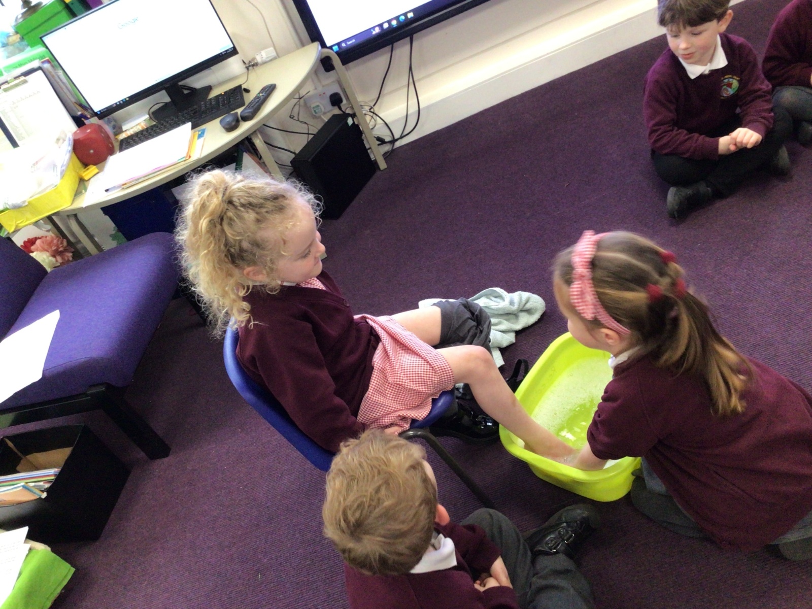 We have started to think about the Easter story. We tasted chocolate eggs, ginger biscuits and hot cross buns – they were delicious! We have explored the story of Palm Sunday through Godly Play, and we washed each other's feet to remind ourselves that Jesus did this for his disciples. We had the story of the Last Supper through Godly Play too.